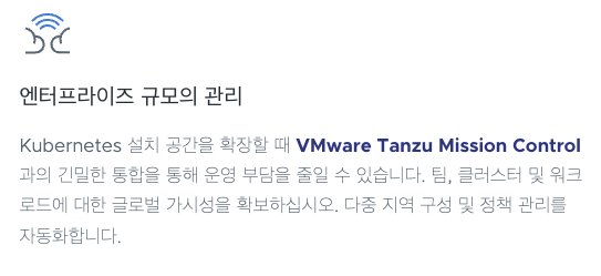 하지만, UI가 빈약 하기 때문에 파트너사의 CMP 포탈 또는 opensource인 octant 등을 같이 설치하여 사용하는것이 일반적이나 규모가 커질수록 이 또한 관리 point가 증가되기 때문에 Tanzu Mission Control (TMC )을 함께 사용한다면 멀티 클러스터 뿐만 아니라 멀티/ 하이브리드 클라우드 전용 kubernetes 관리 모델을 적용할수 있습니다.