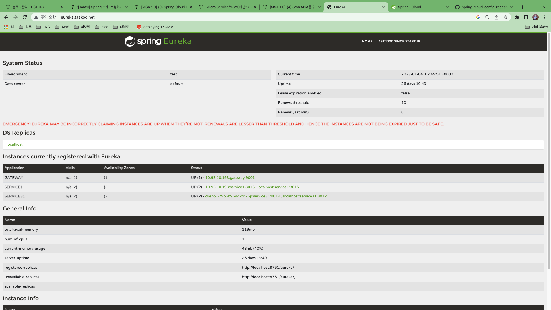 유레카 서버에 service1, service31, gateway서버등이 등록되어 있는것을 확인할수 있다.