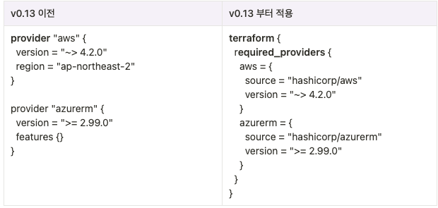 - 테라폼 0.13 버전 이후 부터는 terraform 블록 안에서 프로바이더 버전을 정의