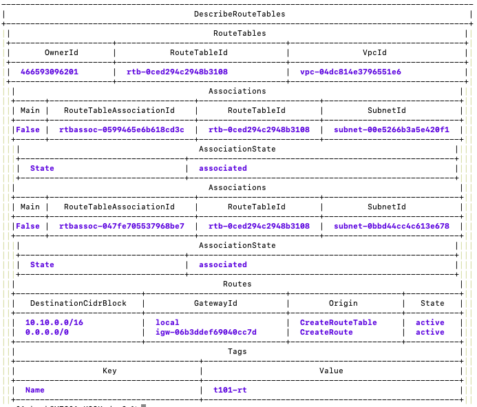 aws ec2 describe-route-tables --filters 'Name=tag:Name,Values=t101-rt' --output table