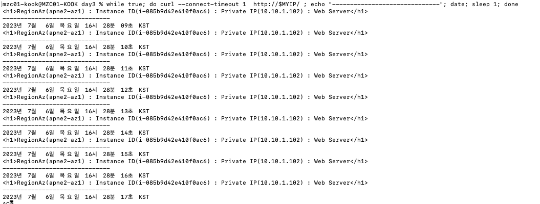 while true; do curl --connect-timeout 1 http://$MYIP/ ; echo "------------------------------"; date; sleep 1; done