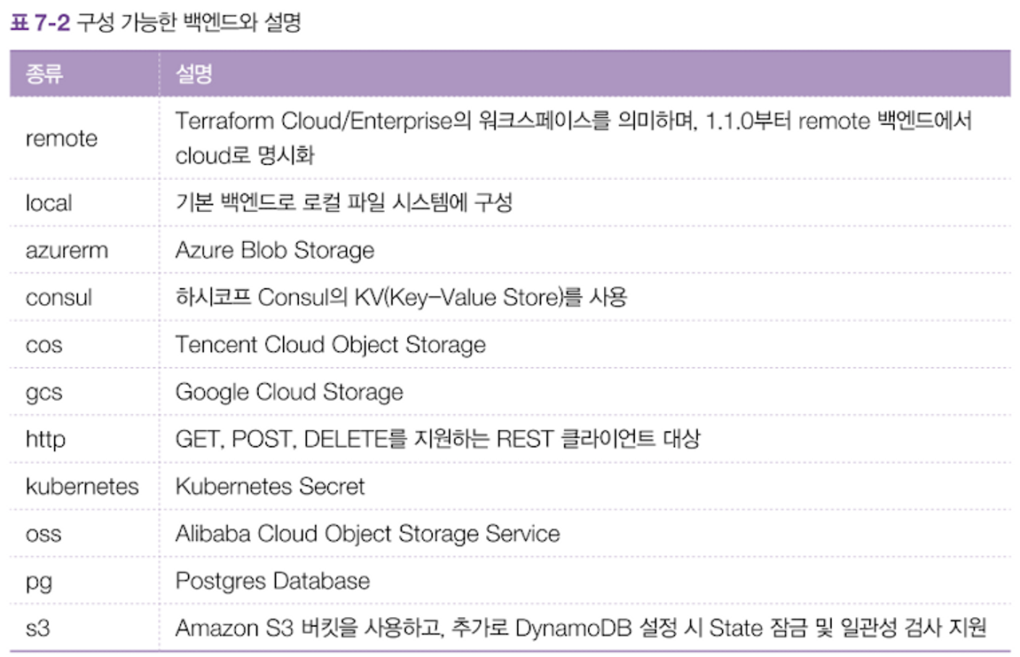 - Agent: 테라폼 실행을 사용자 지정 Agent가 설치된 환경에서 수행이와 같이 State를 추적할수 있음.