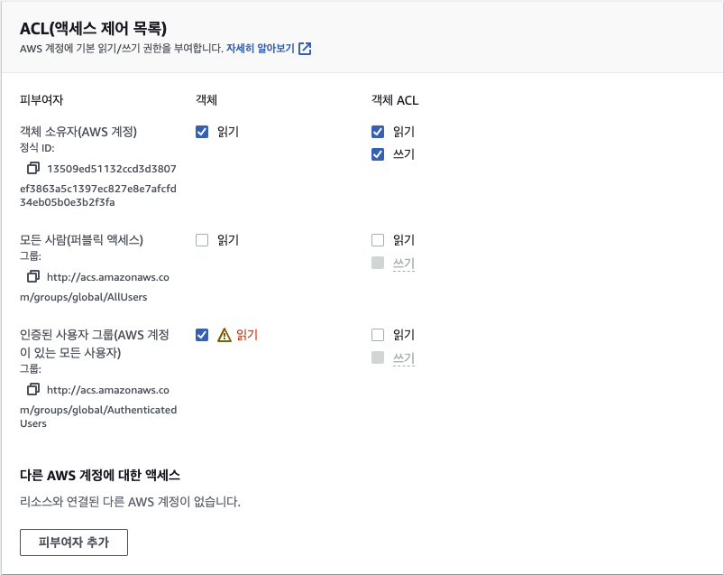 결론 : ACL을 사용하게 되면, 사실상 인증된 전세계 AWS 모든 사용자에게 버킷을 허용하는것이나 마찬가지임