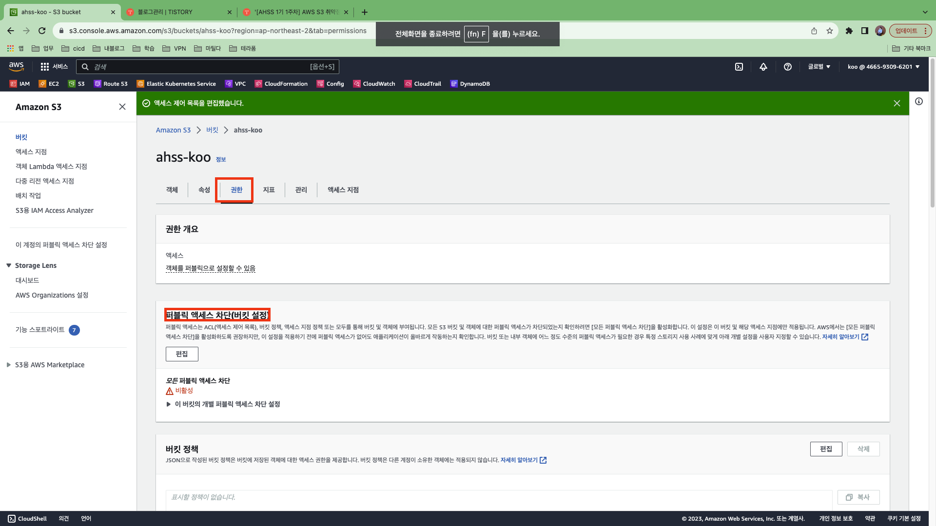 - 퍼블릭 액세스 차단 편집 : (Uncheck) 모든 퍼블릭 액세스 차단을 풀어줄것임