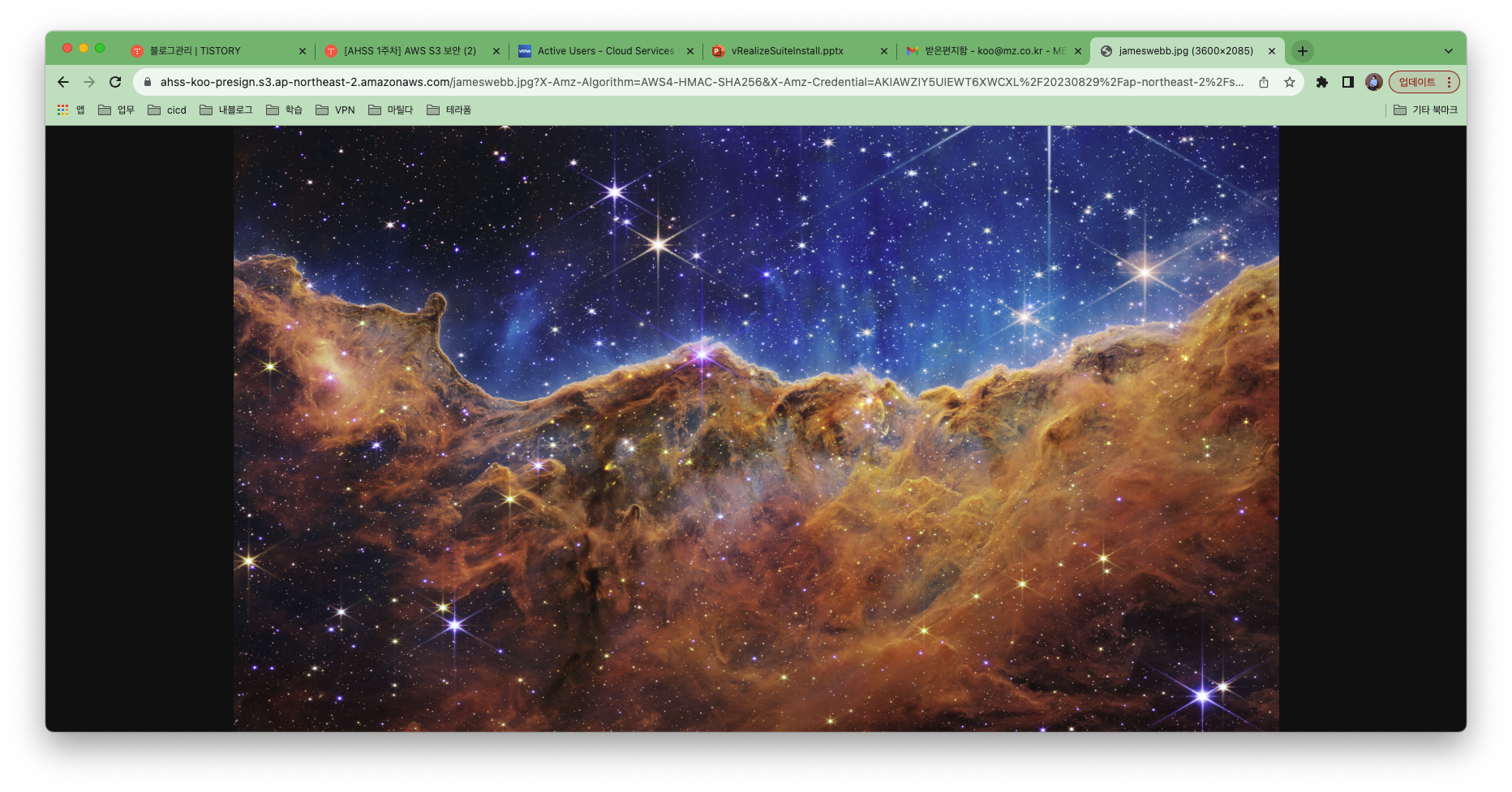 mzc01-kook@MZC01-KOOK Downloads % aws s3api head-object --bucket ahss-$NICKNAME-presign --key jameswebb.jpg --endpoint-url http://s3.ap-northeast-2.amazonaws.com