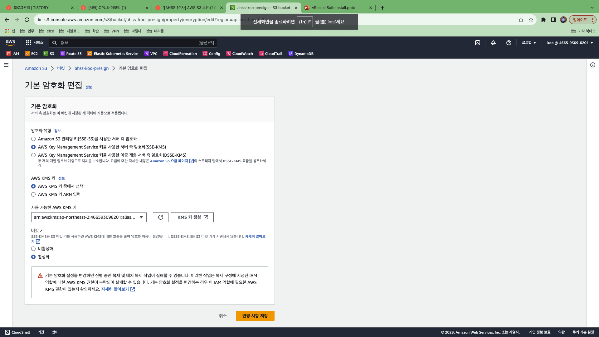 - [AWS 콘솔] 버킷 속성 → 기본 암호화 (편집) : AWS KMS(SSE-KMS), AWS KMS키 중 선택(s3), 버킷 키(활성화)