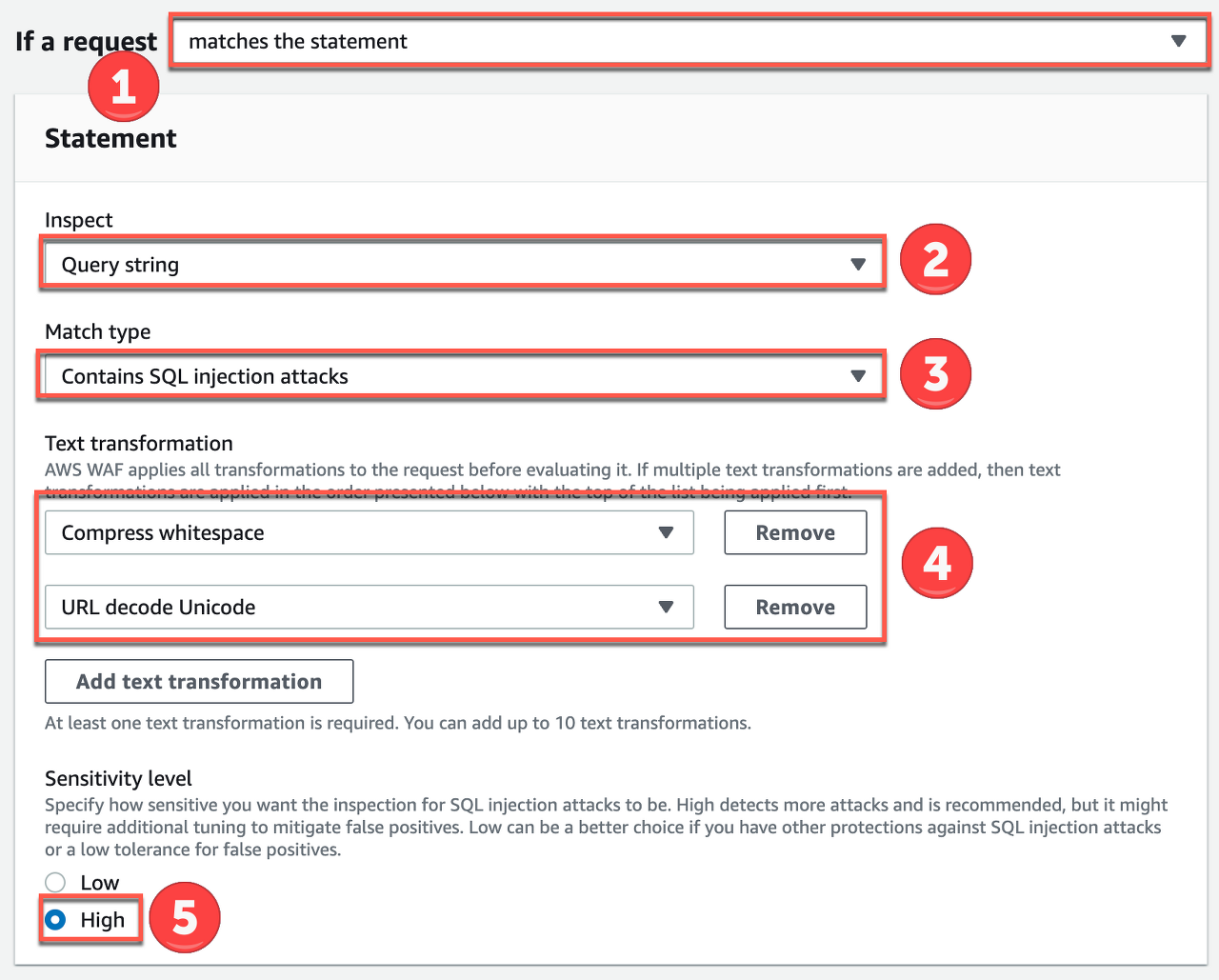 1.3 If a request 의 Pull Down 메뉴에서는 matches the statement 를 선택하고, Inspect 는 Query String, Match Type 은 Contains SQL Injection Attacks 를 선택합니다. Text Transformation 에 대해서는 Compress White Space 와 URL decode Unicode 를 추가합니다. 마지막으로 Sensitivity Level 은 High 를 선택합니다.