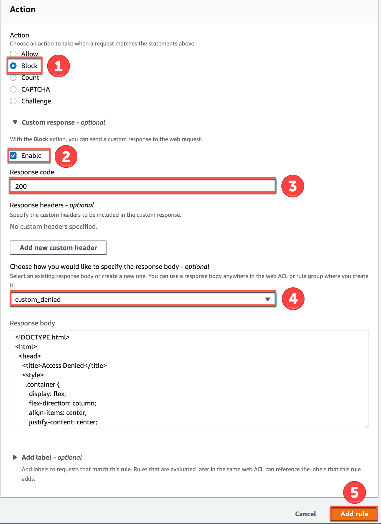 1.4 규칙에 매칭되는 요청을 처리하는 액션은 Block 을 선택합니다. 하단의 Custom response 옵션의 체크 박스를 체크합니다. Response Code 에는 200 을 입력하고 2.2 Web ACL 생성단계에서 생성한 custom_denied 페이지를 선택합니다.