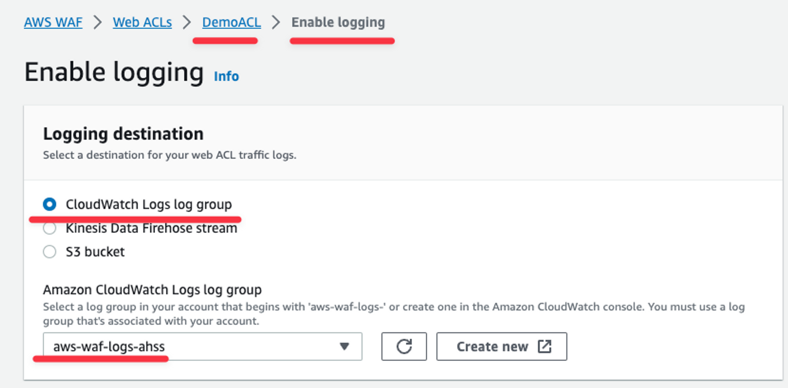 ✅ [ AWS WAF 콘솔 ] - [ Web ACLs ] - [DemoACL] - Enable logging