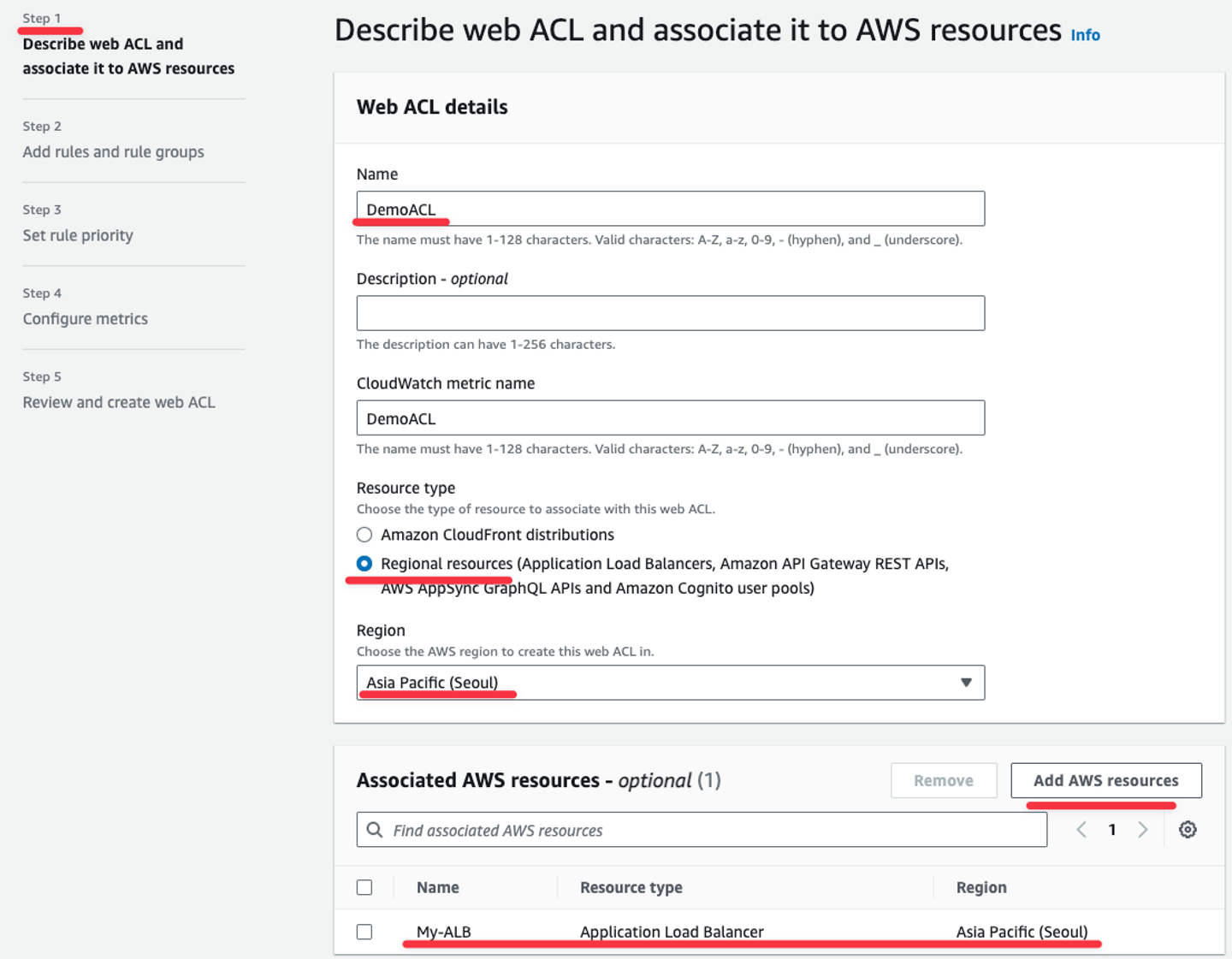 ✅ [ AWS WAF 콘솔 ] -> Seoul -> Create web ACL