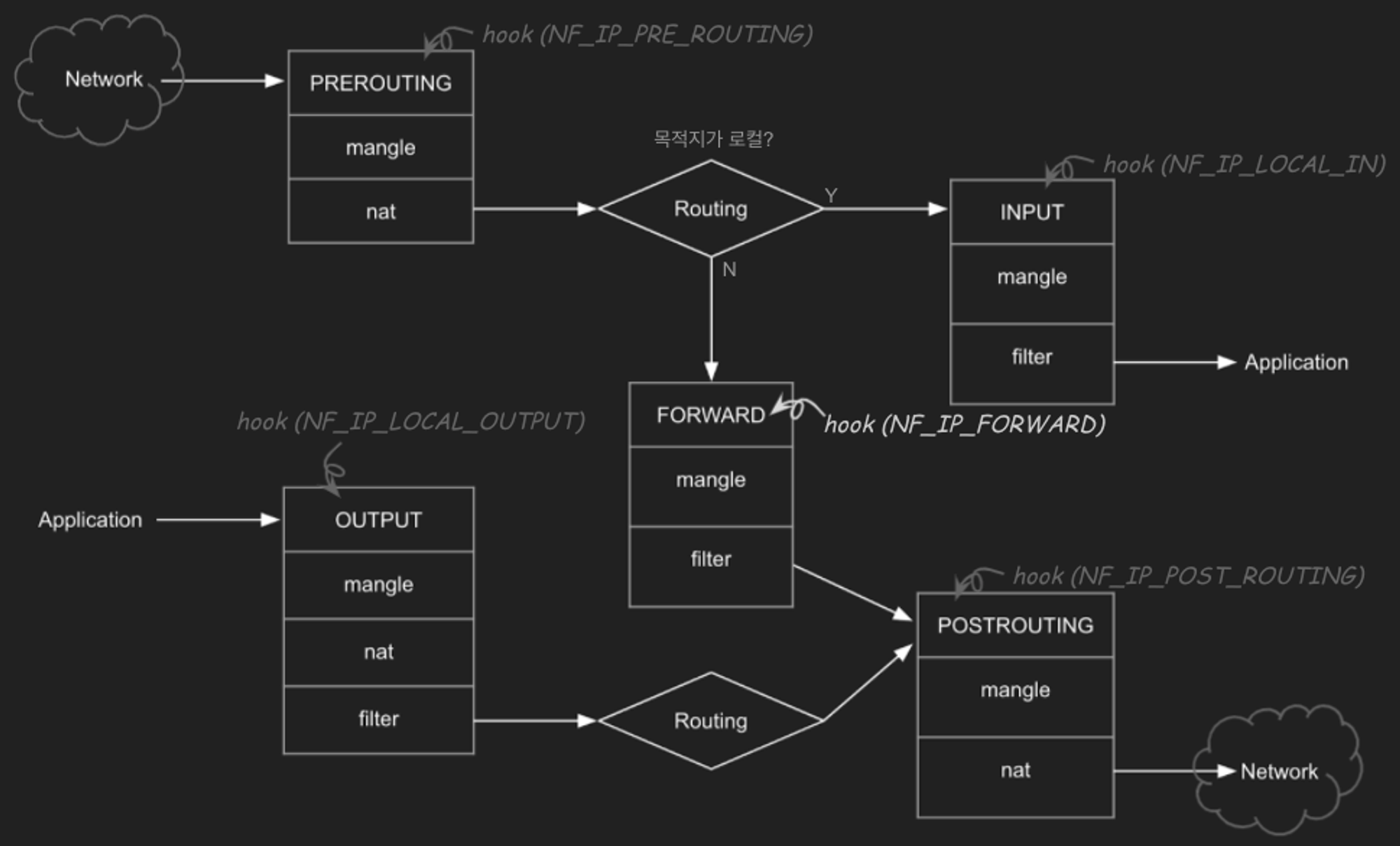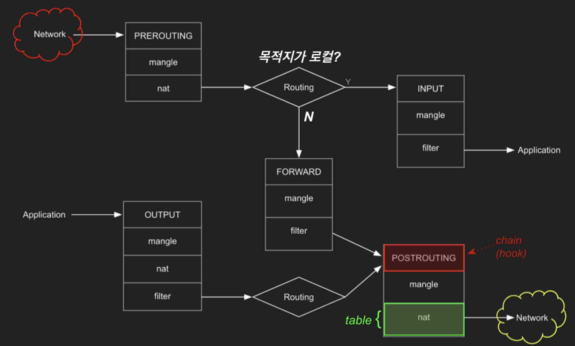 ## POSTROUTING : 라우팅 Outbound or 포워딩 트래픽에 의해 트리거되는 netfilter hook