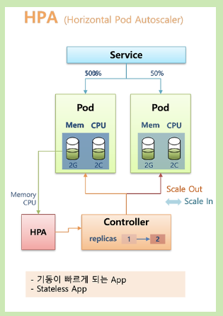 | cAdvisor 이 컨테이너의 메모리/CPU 수집 → metrics-server 는 kubelet 를 통해서 수집 후 apiserver 에 등록 → HPA는 apiserver(Resource API)를 통해서 15분 마다 메모리/CPU 수집하여 정책에 따라 동작 |