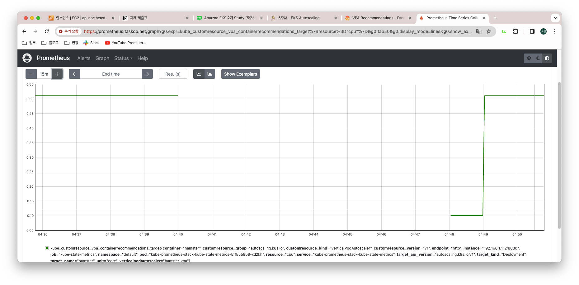 공식 예제 : pod가 실행되면 약 2~3분 뒤에 pod resource.reqeust가 VPA에 의해 수정