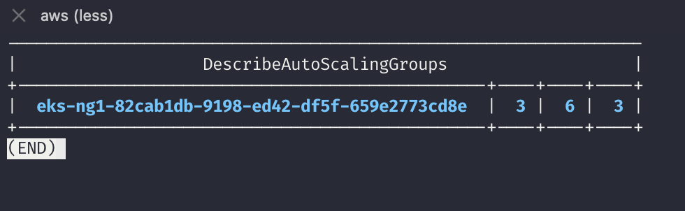 # aws autoscaling describe-auto-scaling-groups --query "AutoScalingGroups[? Tags[? (Key=='eks:cluster-name') && Value=='클러스터이름']].[AutoScalingGroupName, MinSize, MaxSize,DesiredCapacity]" --output table
