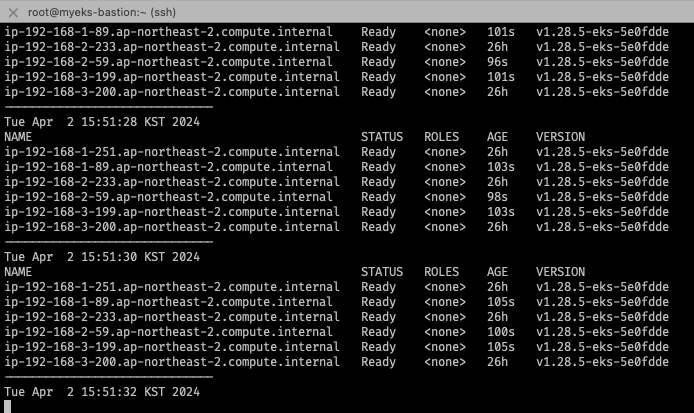 while true; do kubectl get node; echo "------------------------------" ; date ; sleep 1; done