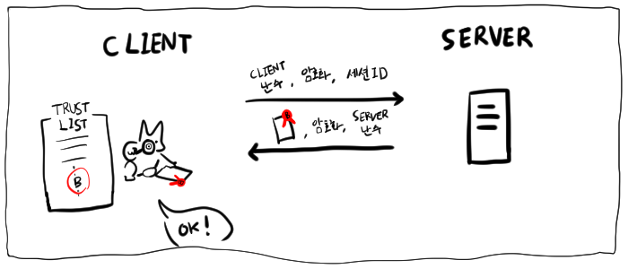 - 클라이언트는 웹브라우저에 등록된 “신뢰할 수 있는 인증서”목록에 있는 공개키로 인증서 해시값 비교