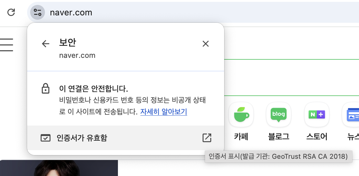 예를들어 네이버의 주소창 왼쪽의 자물쇠를 눌러보면 이렇게 Connection is secure라고 뜨고 밑의 Certificate는 Valid하다고 확인할 수 있습니다.