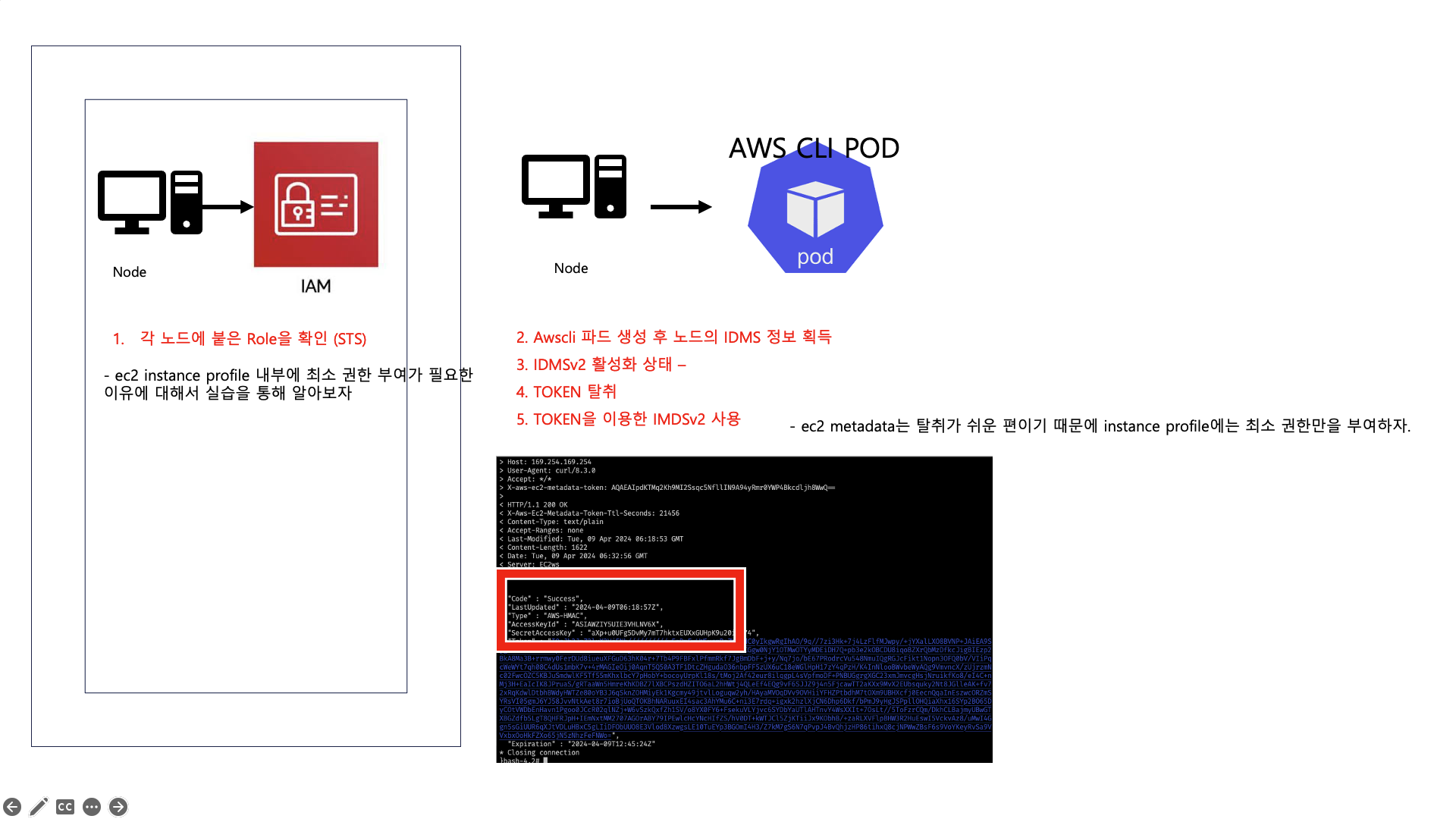 # > 최소권한부여 필요!!! >>> 보안이 허술한 아무 컨테이너나 탈취 시, IMDS로 해당 노드의 IAM Role 사용 가능!