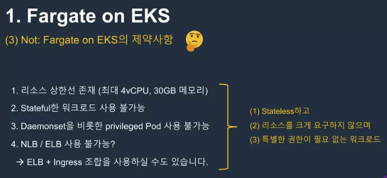 - AWS EKS 와 Fargate를 같이 쓰면 단점?