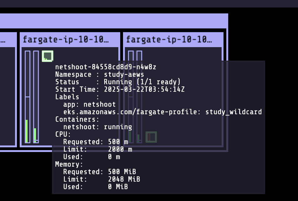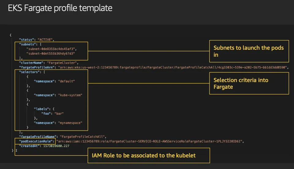 - 파게이트 프로파일(파드가 사용할 서브넷, 네임스페이스, 레이블 조건)을 생성하여 지정한 파드가 파게이트에서 동작하게 함
