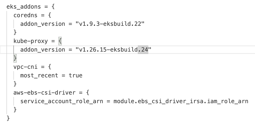 eks 모듈에서 eks 클러스터 구성을 볼 수 있습니다 base.tf. cluster_version의 값은 variable.tf의 변수 cluster_version에 정의되어 있습니다. 현재는 아래처럼 설정되어 있습니다