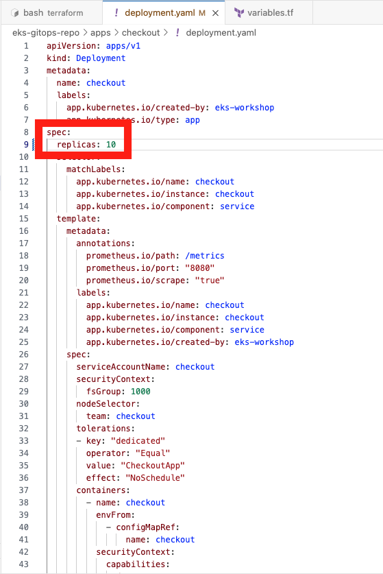 체크아웃 애플리케이션을 확장해 보겠습니다. 이를 위해 아래와 같이 eks-gitops-repo/apps/checkout 폴더의 deposition.yaml 파일에서 복제본을 1에서 15으로 변경합니다.