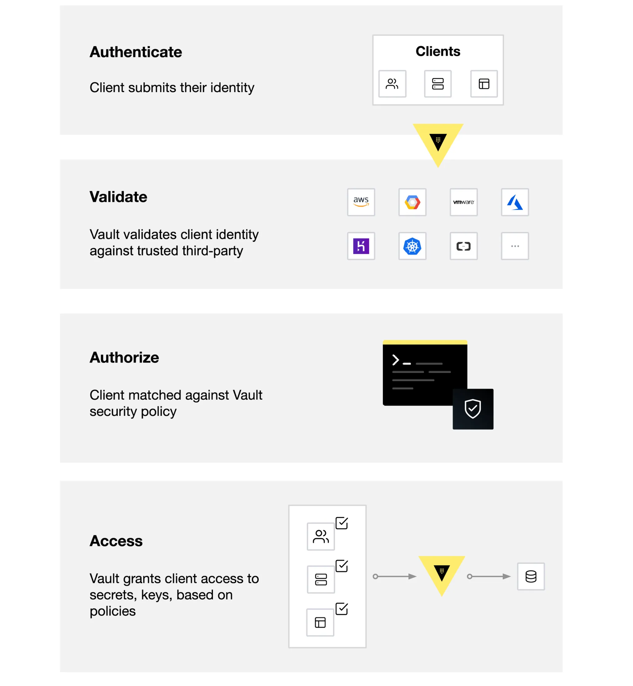 Vault는 클라이언트(사용자, 기계, 애플리케이션 등)를 검증하고 인가한 후에만 비밀이나 저장된 민감한 데이터에 접근할 수 있도록 합니다.