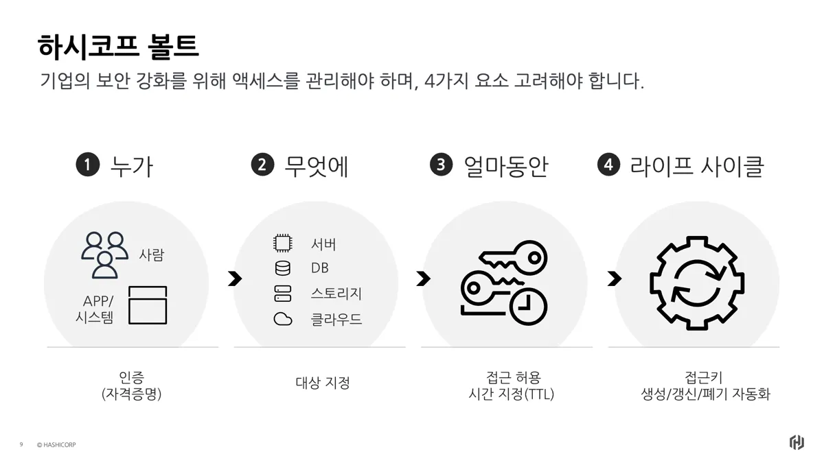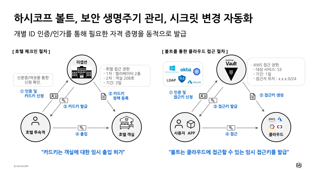 - 접근 (Access): Vault는 클라이언트의 신원에 연관된 정책을 기반으로 토큰을 발급하여 비밀, 키, 암호화 기능 등에 대한 접근을 허용합니다. 클라이언트는 이후 작업에서 해당 Vault 토큰을 사용할 수 있습니다.