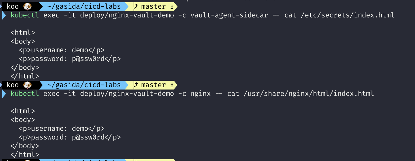 kubectl exec -it deploy/nginx-vault-demo -c nginx -- cat /usr/share/nginx/html/index.html