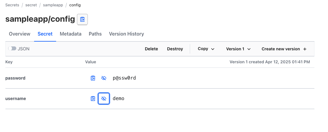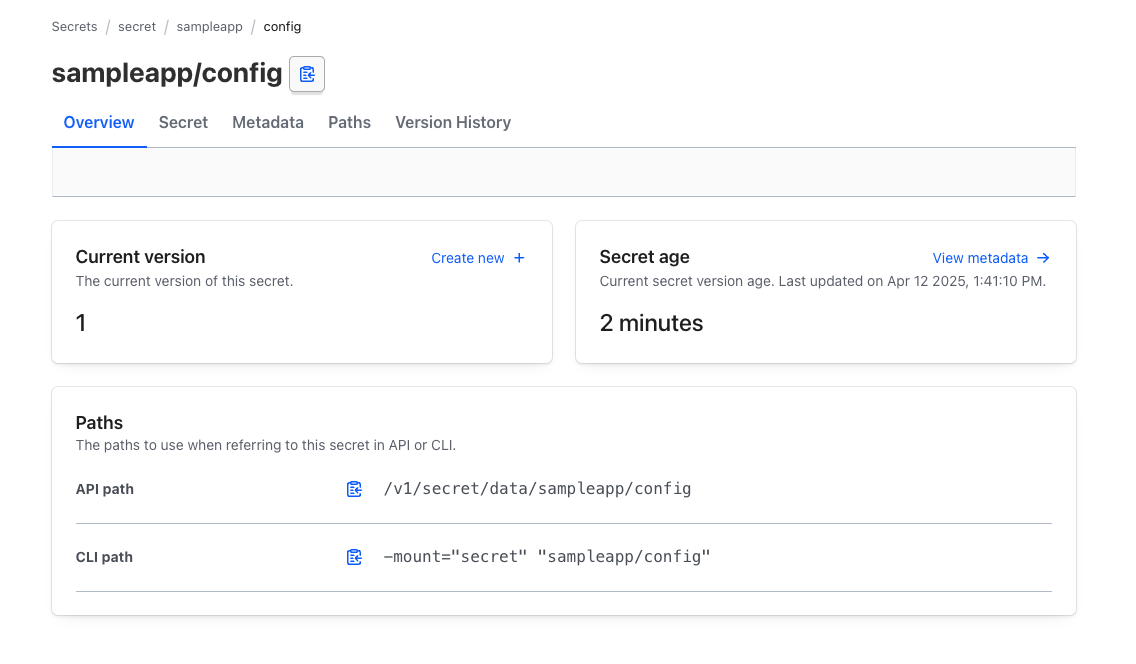 vault.hashicorp.com/agent-inject-secret-config.json: "secret/data/sampleapp/config"