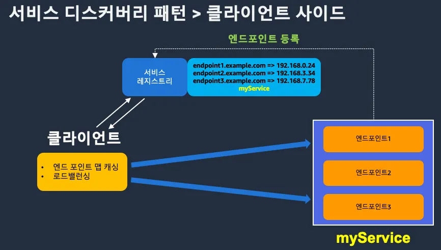 1. 클라이언트 사이드 : 클라이언트가 직접 서비스 레지스트리를 쿼리하여 서비스 위치를 찾는 방식(예: Netflix Eureka, Spring Cloud)