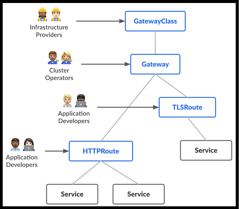 Gateway API는 계층적 구조로 설계되어 인프라 관리자와 애플리케이션 개발자의 역할과 책임을 명확히 구분합니다. 주요 구성 요소는 다음과 같습니다.