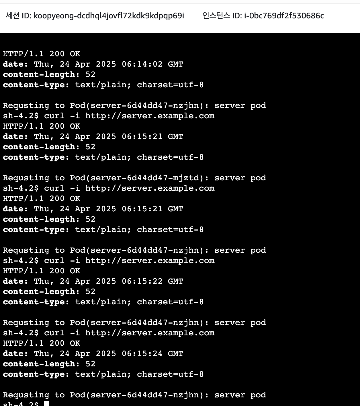 client에서 cluster의 server pod로 요청이 잘 수행되는지 명령을 수행해보겠습니다. 이 과정에서 VPC Lattice로 구성된 서비스 네트워크를 사용해보겠습니다.