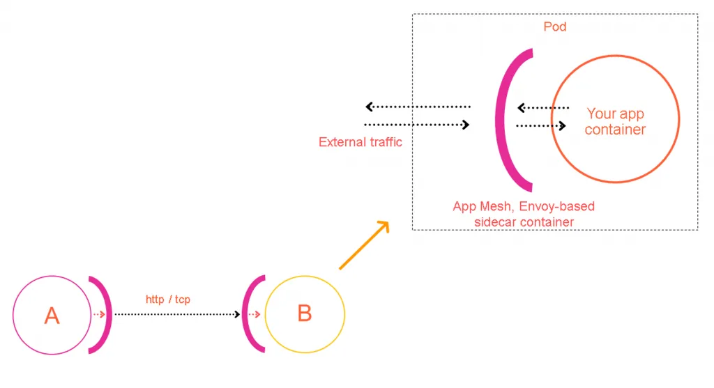 - 컨테이너 애플리케이션 앞에 AWS AppMesh, Istio, Linkerd 등의 사이드카 프록시 컨테이너를 배치