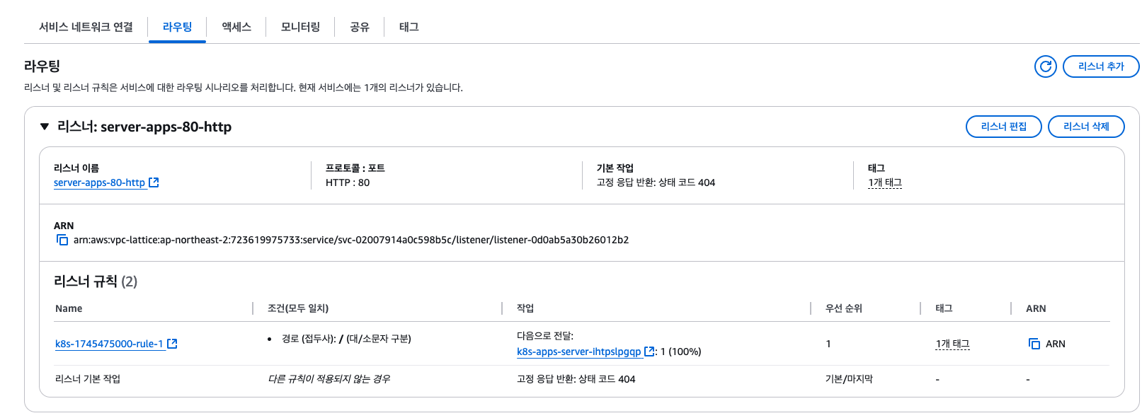 VPC Lattice Service의 세부 항목 중, Routing 섹션을 클릭하면 아래와 같은 Listener 규칙과 함께 대상 그룹을 확인할 수 있습니다. 대상 그룹의 세부 내용을 보기 위해서 아래 그림과 같이 Listener rules > Action > Forward to 순서로 찾아 대상 그룹을 클릭합니다.