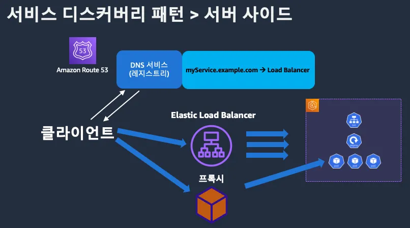 2.서버 사이드 (로드 밸런서가 서비스 레지스트리를 쿼리하고 클라이언트 요청을 적절한 서비스로 라우팅)