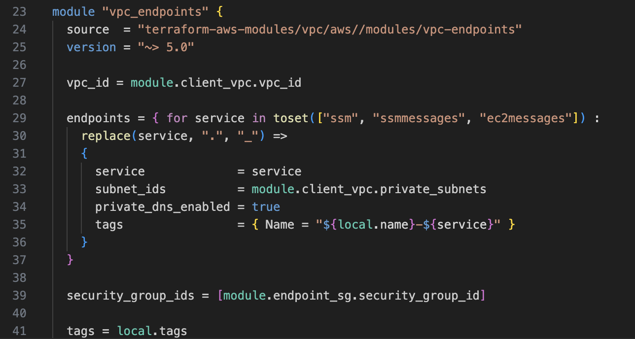 이어서 vpc_endpoints 모듈에서는 client에서 Systems Manager를 사용하기 위한 VPC Endpoint를 구성하기 위한 명세가 적혀있습니다.