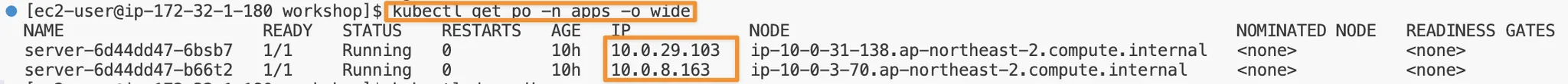 POD 의 IP address와 Port 번호를 통해 VPC Lattice Service로의 라우팅 대상을 안내하고 있습니다.