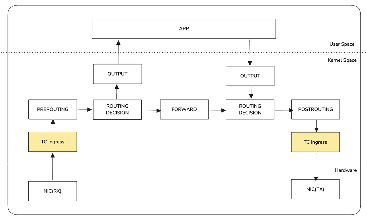 NIC → XDP → TC (clsact/qdisc) → Netfilter/iptables → Socket → Application