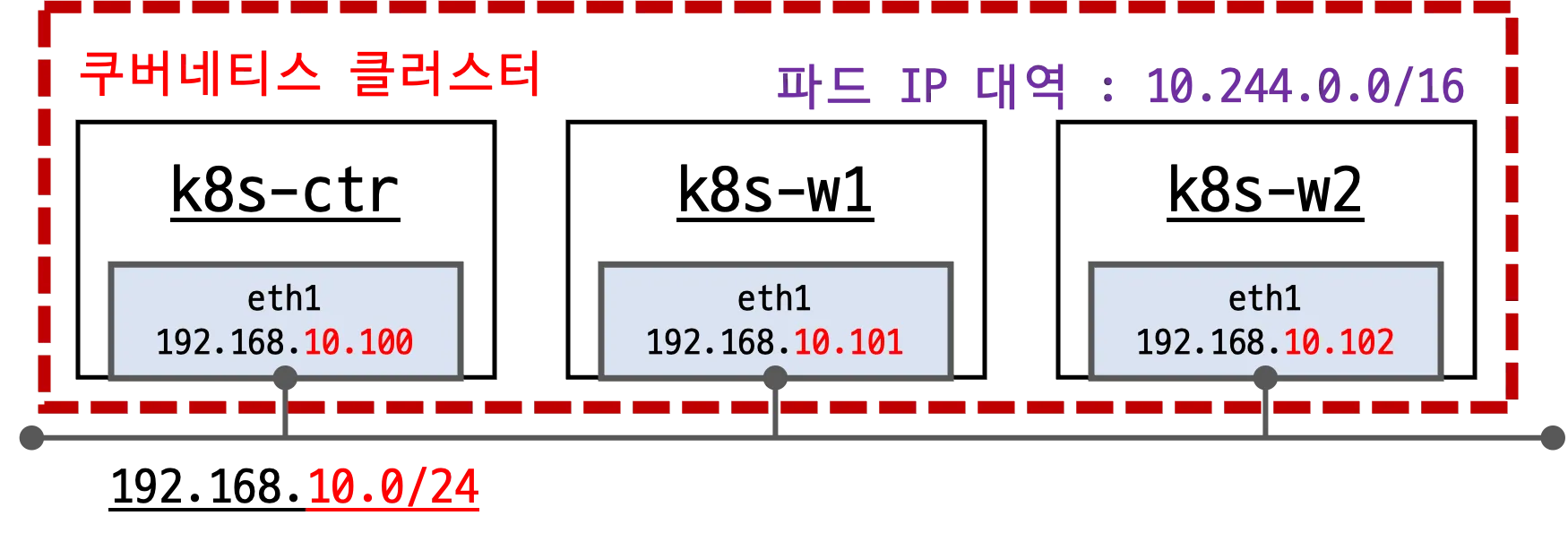 - 기본 배포 가상 머신 : k8s-ctr, k8s-w1, k8s-w2
