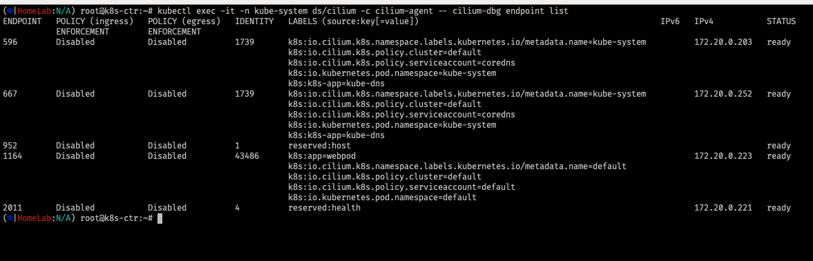 kubectl exec -it -n kube-system ds/cilium -c cilium-agent -- cilium-dbg endpoint list