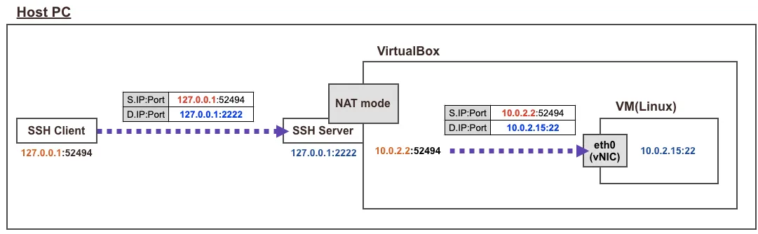 - vagrant ssh 접속 시 호스트에 127.0.0.1(2222)를 목적지로 접속 → 이후 포트포워딩(S/DNAT)을 통해서 내부에 VM로 SSH 연결됨