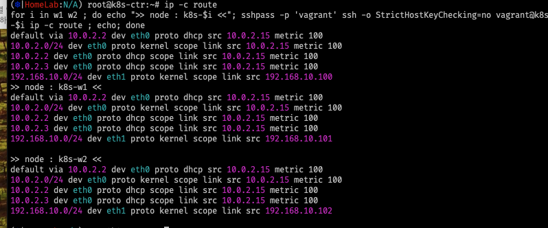 for i in ctr w1 w2 ; do echo ">> node : k8s-$i <<"; vagrant ssh k8s-$i -c 'ip -c -4 addr show dev eth0'; echo; done #