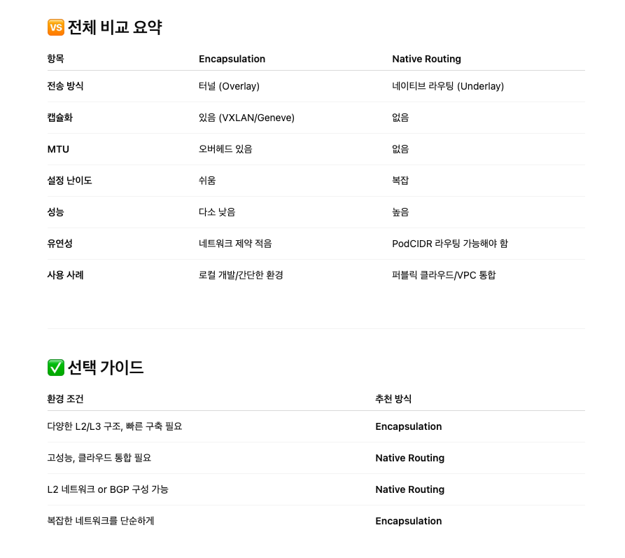 💬 Tip: AWS, GCP, Azure 같은 퍼블릭 클라우드에서는 Native Routing + CNI 연동이 일반적입니다. 하지만 네트워크 구성 권한이 없거나 복잡한 라우팅이 어려운 환경이라면 Encapsulation 방식이 더 실용적입니다.