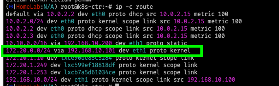 - 172.20.0 대역에 대한 모든 IP에 대해서 node eth1로 보낸 후 워커노드 101번으로 보냄