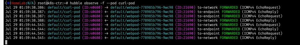Jul 27 04:21:27.649: default/curl-pod (ID:15584) <- default/webpod-857687f8b6-wdxhq (ID:46396) to-endpoint FORWARDED (ICMPv4 EchoReply)