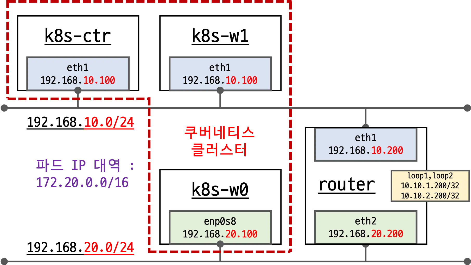 이 환경에서는 클러스터 네트워크와 외부 네트워크 간에 직접 라우팅이 가능하도록 구성되어 있습니다.