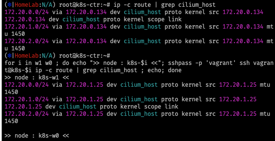 for i in w1 w0 ; do echo ">> node : k8s-$i <<"; sshpass -p 'vagrant' ssh vagrant@k8s-$i ip -c route | grep cilium_host ; echo; done