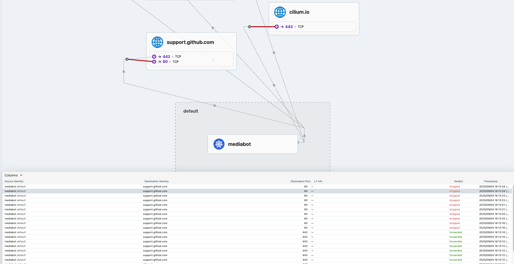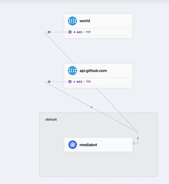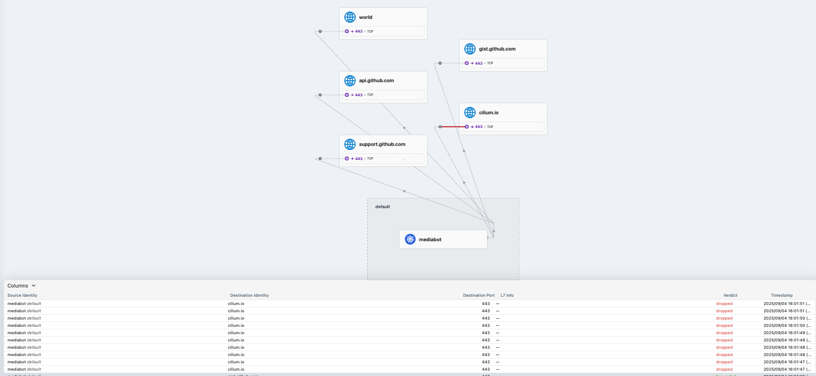 - 두 번째 출구 섹션은 mediabot포드가 kube-dns서비스에 접근할 수 있도록 합니다. Cilium이 지정된 패턴과 일치하는 DNS 조회를 검사하고 허용하도록 지시합니다. 이 경우 모든 DNS 쿼리를 검사하고 허용합니다.rules: dns